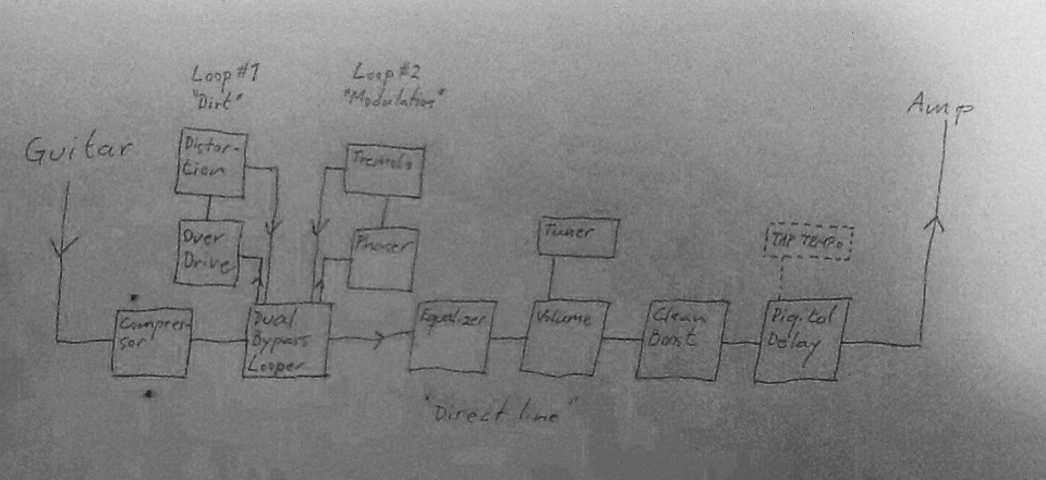 Bright Onion Looper (Out) > DOD Equalizer > Ernie Ball Jr Volume Pedal > TC Electronic Alter Ego Digital Delay